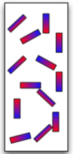 Imagine the free-flowing electrons of a metal. Each electron has a north pole (blue) and a south pole (red). In the image to the left, the electrons point every which way so the metal is not magnetic.